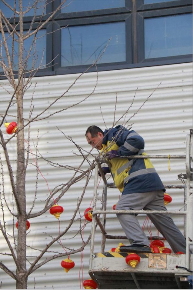 為給園區(qū)營(yíng)造濃厚的節(jié)日氣氛,給入駐企業(yè)帶來(lái)如家般的溫情呵護(hù),沈陽(yáng)航發(fā)展運(yùn)營(yíng)管理有限公司物業(yè)團(tuán)隊(duì),在零下二十度的氣溫下,凍紅了雙手,冰覆了睫毛,但他們依然堅(jiān)守,扶梯的扶梯、攀爬的攀爬,將火紅的燈籠掛在園區(qū)主干道、企業(yè)門前。滿街的火紅,是他們對(duì)園區(qū)的熱愛(ài),也是對(duì)工作的執(zhí)著,更是對(duì)崗位責(zé)任的滿滿執(zhí)念。園區(qū)的燈亮了,客戶們洋溢的笑臉,映襯著角落里一道道靚麗的風(fēng)景線,夜幕降臨下,五彩斑斕的彩色燈光給園區(qū)增添了不少喜慶的色彩,也深深的印在了師傅們熱切的心里。