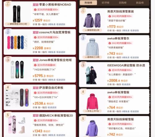 在今年某購物平臺“雙十一”的滑雪裝備熱銷榜中,滑雪板與滑雪服位列最受歡迎的前十名,成為大眾消費的熱點。目前,滑雪板的普遍價格在2000元左右,而滑雪服則多在500至1000元區(qū)間。